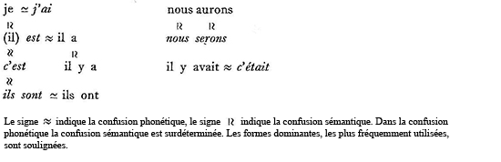 Le patoisant confond s / z et š / ž en toutes positions. L’apprentissage du français par les enfants à l’école maternelle n’est pas l’abri des phénomènes d’interférence qui sont nombreux et complexes. Certaines de leurs conséquences peuvent s’illustrer par l’apprentissage d’être et avoir. Le cas de ces verbes est important à cause de la fréquence élevée de leur emploi. Les changements morphologiques, qui affectent ces verbes à presque toutes les personnes au présent, n’aident pas les enfants à établir la distinction des différentes personnes, ni à comprendre la fonction particulière de ces verbes. Par contre, leur fréquence élevée dans l’usage parlé entraîne la constitution d’une constellation de rapports particuliers, fondée sur des confusions phonétiques et sémantiques. Ces rapports sont schématisés ci-dessous.