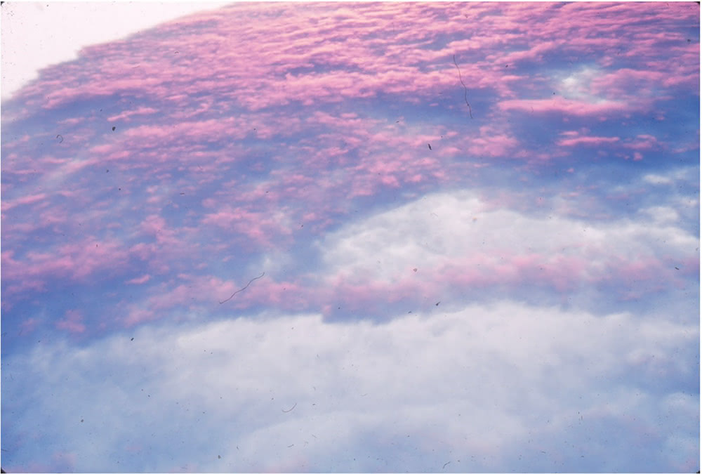 One particular photo-text pairing in the Literatuurmuseum exhibit allows for further exploration of how Hermans’s photographic and textual representations of Norway respectively function. The photograph “1107 (33) Middernachtshemel” [Midnight Sky], which depicts a pink-tinged cloud formation, is associated with text from Chapter 35: “A rippling, fluffy blanket of pink is pulled across the sky by invisible hands. It doesn’t keep me warm, in fact I feel very chilly, so I get up again” (Hermans 2020: 240).20 This pairing raises questions about light, an important motif in the novel and also a foremost consideration in the field of photography. Light is also an effective starting point for analysis because it clearly articulates the respective functions of photographic and textual representation.