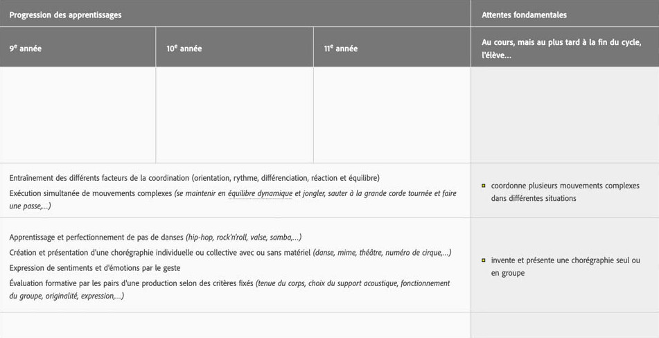 Nous pourrions nous attendre à une explicitation plus fine des contenus d’apprentissage découlant de la pratique de la danse dans la section consacrée à la progression des apprentissages et aux attentes fondamentales associées à cet objectif. Tel n’est pas le cas.
