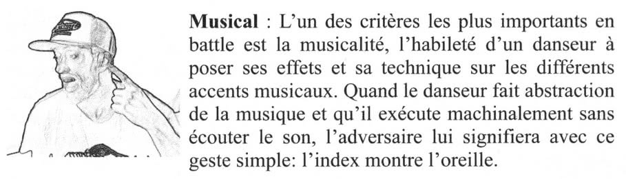 Une proposition d’activité pourrait consister à amener l’élève à comparer cet extrait avec une séquence vidéo d’un battle de hip-hop, afin d’identifier les similitudes dans l’agencement spatial et de relever comment ces configurations génèrent des structurations plastiques spécifiques du spectacle dans un jeu d’appels et de réponses. Cela se manifeste notamment lorsque plusieurs danseurs entrent en scène simultanément, comme on peut l’observer à 5:15 de cet extrait47 (CercleUnderground, 2016) issu d’une battle de popping. L’effet de détournement peut être appréhendé à travers les attitudes corporelles et les expressions faciales des danseurs, qui reproduisent des gestes quotidiens empruntés à l’univers urbain, rendant parfois floue la distinction entre mouvements spontanés et gestes chorégraphiés. Ce processus donne lieu à un véritable alphabet gestuel codifié, constituant un mode de communication propre aux danseurs (voir en annexes). À titre d’exemple, dans l’extrait suivant48 (Red Bull BC One, 2023), une b-girl49 effectue un geste signalant que son adversaire a reproduit deux fois la même figure, transgressant ainsi une règle implicite des battles qui proscrit la répétition d’une même technique (voir le code « Déjà fait » dans les annexes).