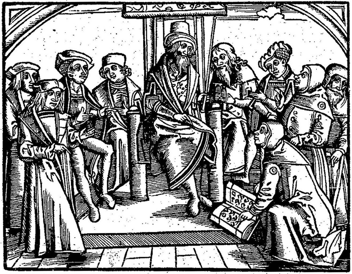 Dans le contexte d’une adaptation du rituel juratoire pour instaurer la confiance, l’évocation d’une peau de cochon sur laquelle le jureur juif devrait se tenir ne laisse pas d’étonner. Elle se trouve dans le Schwabenspiegel, puis dans des versions plus tardives du Miroir des Saxons (Sachsenspiegel)19. La question est bien sûr de savoir si un dispositif si offensant a pu être appliqué20. L’iconographie donne une première réponse : un manuscrit illustré du Schwabenspiegel, justement produit à Haguenau dans l’atelier de Diebold Lauber, vers 1430, met bien en scène cette peau, ce qui correspond parfaitement au texte, qui comporte des passages problématiques pour un jureur juif (fig. 1)21. Au contraire, dans le Laienspiegel, manuel ou formulaire imprimé en 1509 à Augsbourg puis l’année suivante à Strasbourg, ni le texte, ni la gravure l’accompagnant n’évoquent une peau de cochon. Or cet ouvrage rédigé par Ulrich Tengler, un temps secrétaire de la ville de Nördlingen, était destiné à ses confrères des chancelleries urbaines et avait donc des visées plus directement pratiques que le Miroir de Souabe22. Notons d’ailleurs qu’alors que l’illustration du Schwabenspiegel affuble le juif d’un chapeau caractéristique, la gravure des éditions strasbourgeoise comme augsbourgeoise du Laienspiegel le présente la tête couverte d’un bonnet neutre (fig. 2). En revanche, le jureur comme d’autres personnes autour de lui portent sur leur vêtement une rouelle qui les désigne comme juifs. De plus, il pose non la main droite, mais la gauche sur le livre23.