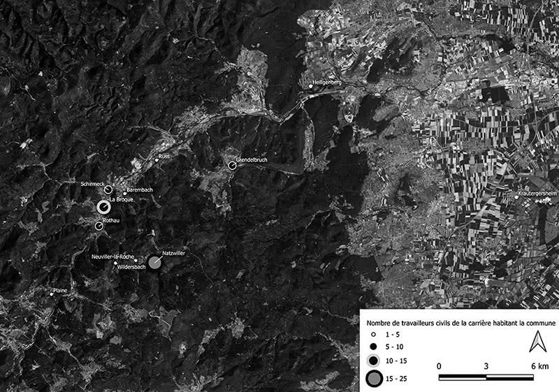 Ces noms permettent de reconstituer une carte de répartition des travailleurs civils en fonction de leur commune de résidence (figure 10). Ils habitent presque exclusivement au sein de la vallée de la Bruche, seuls deux d’entre eux proviennent de Krautergersheim (à proximité d’Obernai). Ces deux derniers (Christ Joseph et Stoeffler Joseph49) étaient d’ailleurs logés à Rothau la semaine, et ne rentraient chez eux que le week-end. Une majorité (23) sont des habitants de Natzwiller, soit la commune où s’installe le camp. Les communes de Rothau et La Broque sont aussi très représentées. Les civils proviennent donc des communes des environs proches du camp.