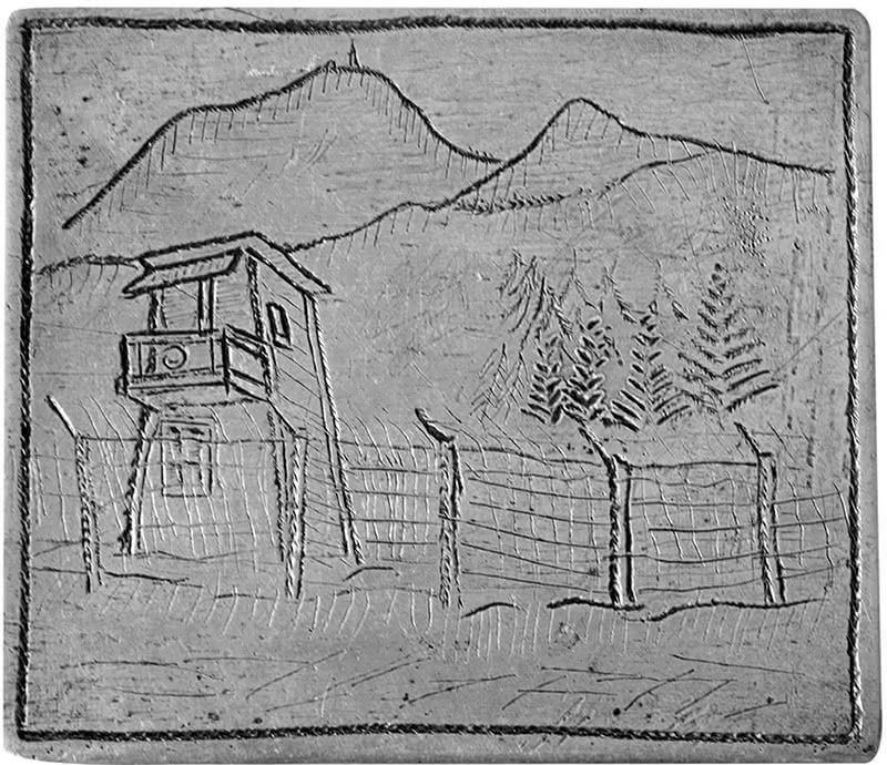 Figure 4 : Décor d’une boîte à cigarette en aluminium, don du déporté Japp von Mesdag (néerlandais, déporté NN, matricule 4415)