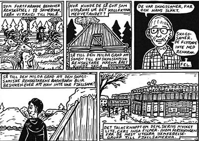 The Sámi can be divided into different groups: Reindeer herding and Mountain Sámi, Fishing Sámi, and Forest Sámi. This division refers to the Sámi groups living on the Swedish side (of Sápmi). Besides these four groups, other groups can be added. The first group are the Migrant Sámi, who migrated to the South for work and education. Elle Marja in Sami blood is a good example. The second group are the Lost Sámi, who lost their identity due to Swedish politics. Many members were even denied their past and roots. Sami blood and Mats Jonsson’s comic novel demonstrate this process. The third group are the New Sámi, who rediscovered their Sámi roots. The protagonist of Jonsson’s När vi var samer represents the painful discovery of the lost identity and also tries to understand the denial of the Sámi identity by his grandfather. The fourth and last group are the Sámi fans, persons who are not Sámi themselves but strongly identify with Sámi people. Jonsson’s comic novel mentions this group (2021: 211).