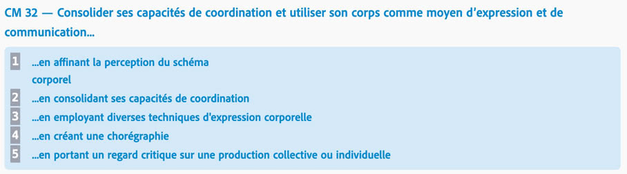 Parmi les composantes associées, la numéro 4 mentionne explicitement la danse en engageant l’élève dans la création d’une chorégraphie, ce qui souligne l’attention portée à la dimension poïétique de la pratique corporelle envisagée. La composante 5 introduit une exigence réflexive, en prescrivant le développement d’une posture critique face aux productions chorégraphiques des pairs, qu’elles soient individuelles ou collectives.