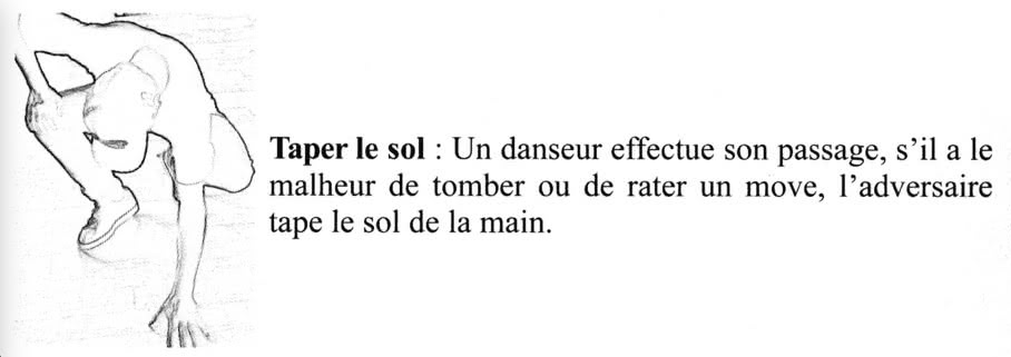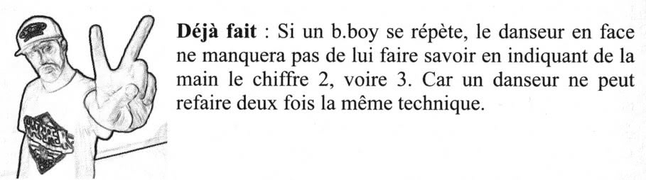 Une proposition d’activité pourrait consister à amener l’élève à comparer cet extrait avec une séquence vidéo d’un battle de hip-hop, afin d’identifier les similitudes dans l’agencement spatial et de relever comment ces configurations génèrent des structurations plastiques spécifiques du spectacle dans un jeu d’appels et de réponses. Cela se manifeste notamment lorsque plusieurs danseurs entrent en scène simultanément, comme on peut l’observer à 5:15 de cet extrait47 (CercleUnderground, 2016) issu d’une battle de popping. L’effet de détournement peut être appréhendé à travers les attitudes corporelles et les expressions faciales des danseurs, qui reproduisent des gestes quotidiens empruntés à l’univers urbain, rendant parfois floue la distinction entre mouvements spontanés et gestes chorégraphiés. Ce processus donne lieu à un véritable alphabet gestuel codifié, constituant un mode de communication propre aux danseurs (voir en annexes). À titre d’exemple, dans l’extrait suivant48 (Red Bull BC One, 2023), une b-girl49 effectue un geste signalant que son adversaire a reproduit deux fois la même figure, transgressant ainsi une règle implicite des battles qui proscrit la répétition d’une même technique (voir le code « Déjà fait » dans les annexes).