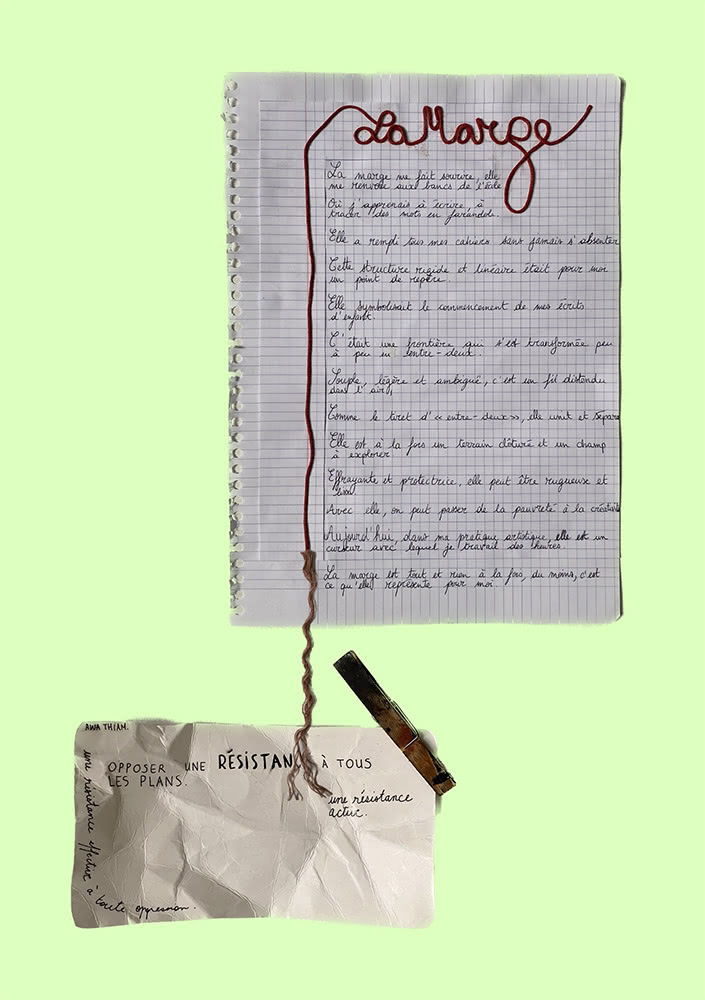 En collaboration avec les étudiantes du master Arts plastiques : recherches et pratiques situées, nous nous sommes interrogées sur la signification de la marge pour chacune d'entre nous. À travers diverses formes (poétiques, artistiques…) nous vous présentons ici, les témoignages intimes et créatifs de nos réflexions assemblés au cours d’un workshop.
