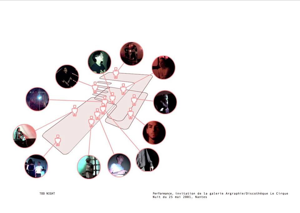 La notion de temps est au cœur de l’œuvre Too Night de Carole Douillard. Réalisée le 25 mai 2001 à Nantes, cette performance a mis à contribution douze performeurs, plongés en immersion dans la boîte de nuit Le Cirque. Elle consistait en l’imitation et la reproduction des « comportements types »7 des fêtards présents. Les performeurs dispersés dans le club devaient maintenir une pose ou répéter ces gestes empruntés pendant la durée d’une heure. Cette heure bien plus « fixe » que ne l’est la temporalité habituelle de la boîte de nuit perturbe les habitudes du lieu. Elle rompt la bulle du présent, cet Urzeit qui ne permet ni passé, ni futur.