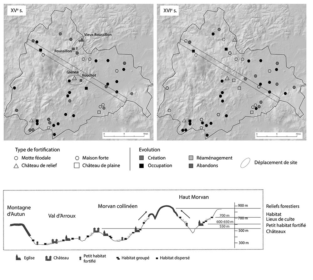 Le sud Morvan se distingue au contraire durant la même période par l’absence de grands défrichements, la stabilité des activités humaines et la rareté des fondations monastiques. L’habitat du secteur semble lui aussi peu modifié, sans réorganisation ni regroupement autour des pôles ecclésiastiques ou castraux, malgré une stabilisation précoce du maillage paroissial et la mise en place d’un dense réseau de châteaux de hauteur et de mottes dès les xie-xiie siècles.